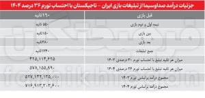 تساوی برای تاجیکستان برای ایران باخت است، اما شکی نیست با رقم 716 میلیارد قطعاً همین باخت برای تلویزیون برد به حساب می‌آید. از آنجایی که این بازی مهم‌ترین بازی تیم ملی بود و در روز پنجشنبه هم برگزار می‌شد، تلویزیون توانست تبلیغ بیشتری بگیرد و مجموع تبلیغات این بازی به بیش از 20 دقیقه رسید و تنها زیرنویس‌های نیمه اول و دوم بازی به 9.2 دقیقه می‌رسد. بنا بر رقم تورم در سال 1403 در آمد تلویزیون از این بازی به بیش از 527 میلیارد تومان و مجموع درآمد بر اساس تورم 1404 به 716.9 میلیارد تومان می‌رسد و این یعنی به اندازه ارزش کل ترکیب تاجیکستان، تلویزیون درآمد داشته است.